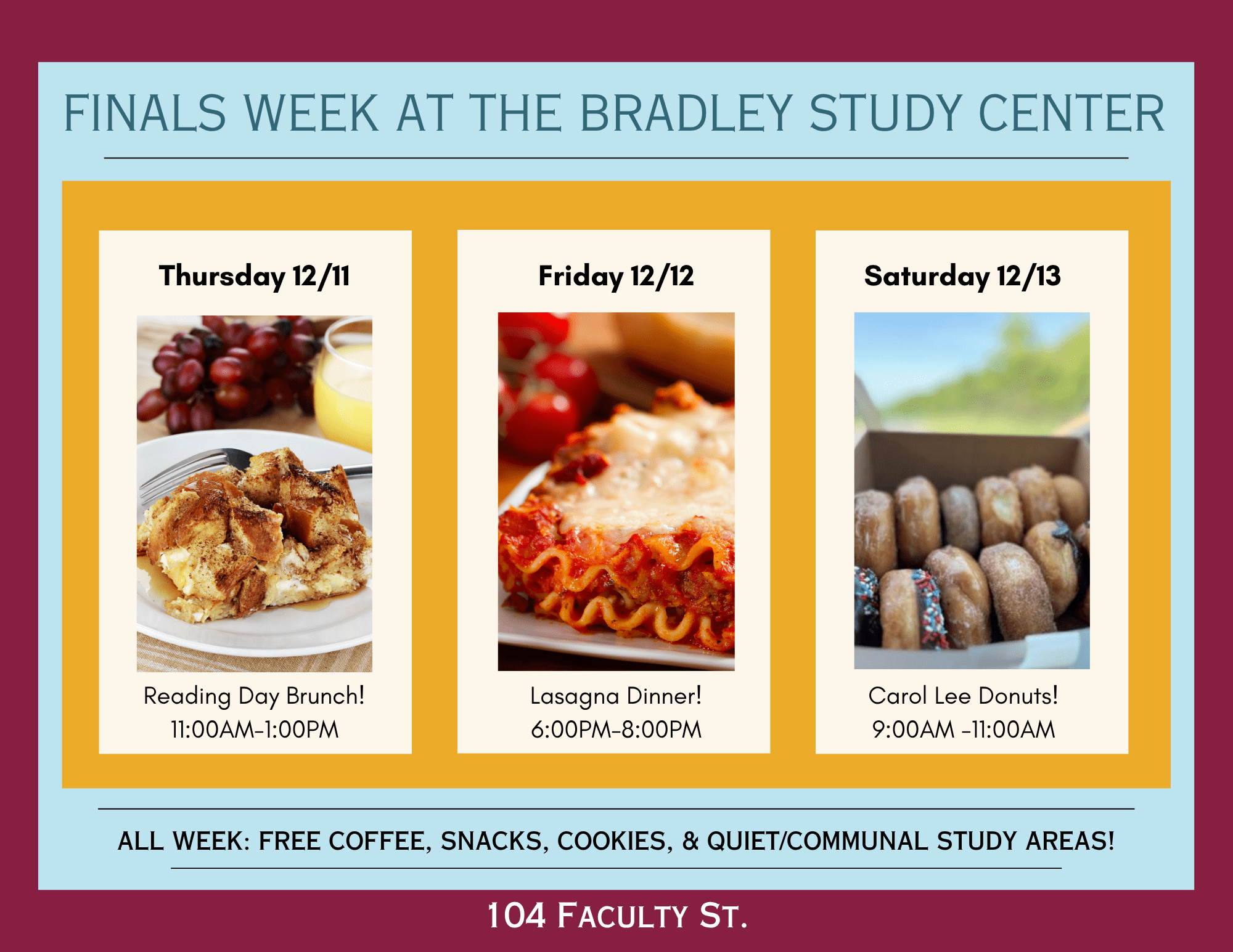 Come by the week leading up to exams for homey food, a festive yet quiet place to study, and encouragement! Here’s our event lineup: