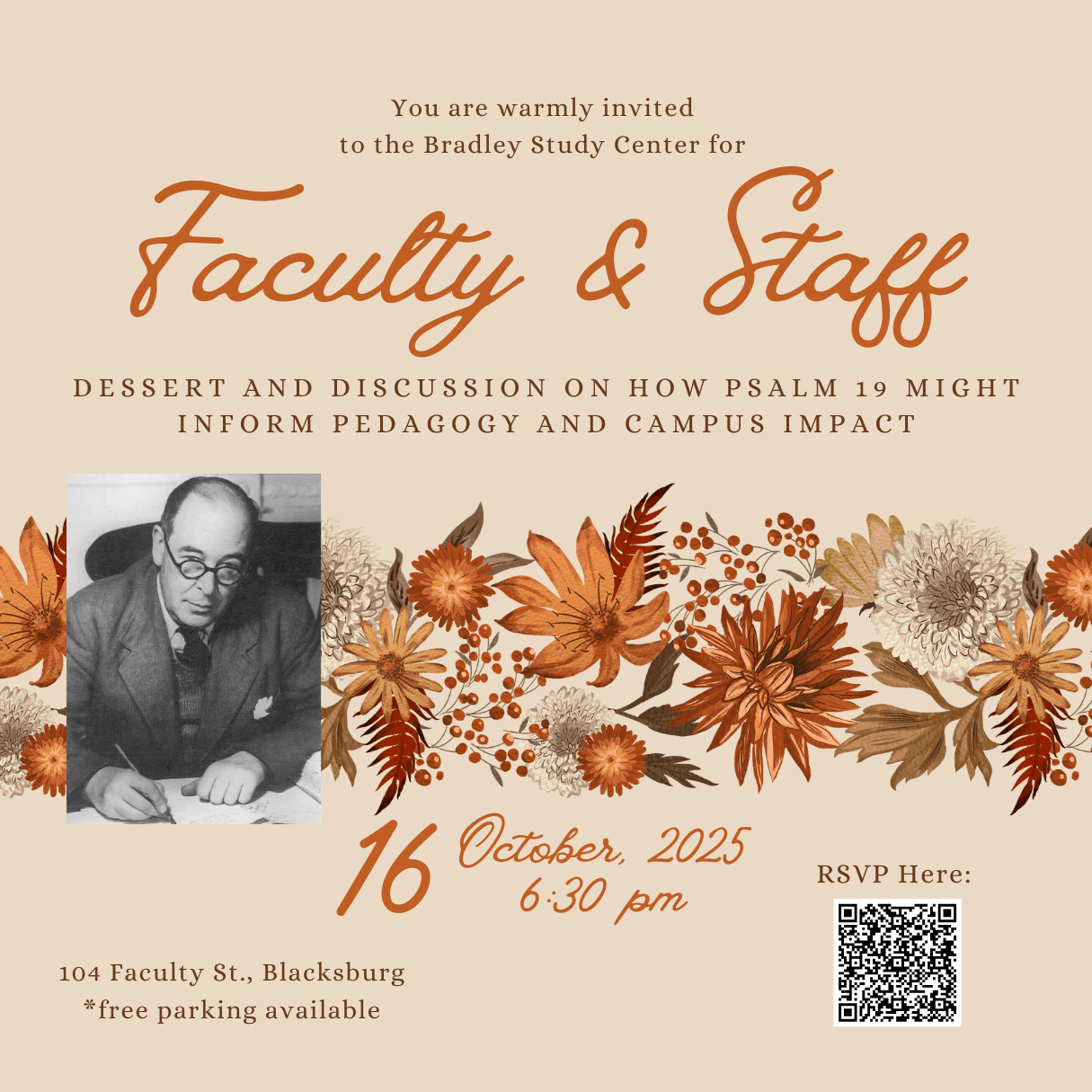 Please invite any fellow faculty/staff members who might be interested in connecting with the study center or with Christian community at VT! We hope for this to be a refreshing and encouraging time for those working in higher education.
