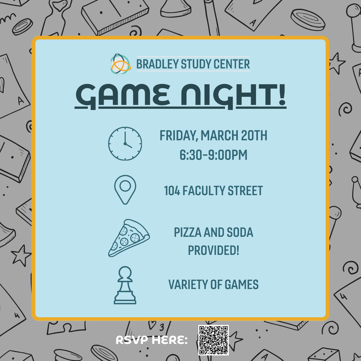 Students! Come by the first Friday back from spring break for a game night at the BSC! We’ll have pizza, snacks, and an assortment of board games to play. You are encouraged to bring your own game to share as well! Depending on how many people come, we could have several games going on around the building or just a few!