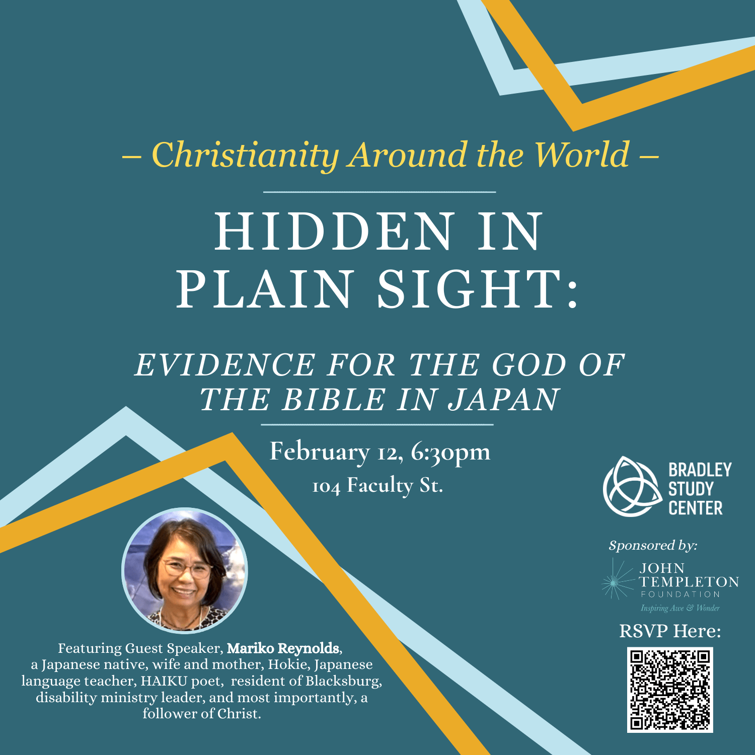 Join us Thursday, February 12 to hear from Guest Speaker, Mariko Reynolds, who will be sharing about the presence and work of Christ in Japan, both across its history as a nation and in our present time.