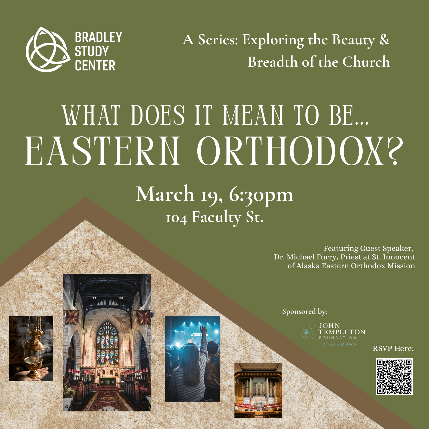 We’ll be continuing this series on Thursday evening, February 5 by exploring the Eastern Orthodox tradition with Guest Speaker, Father Michael Furry, Priest at St. Innocent of Alaska Eastern Orthodox Mission. We hope you’ll join us!